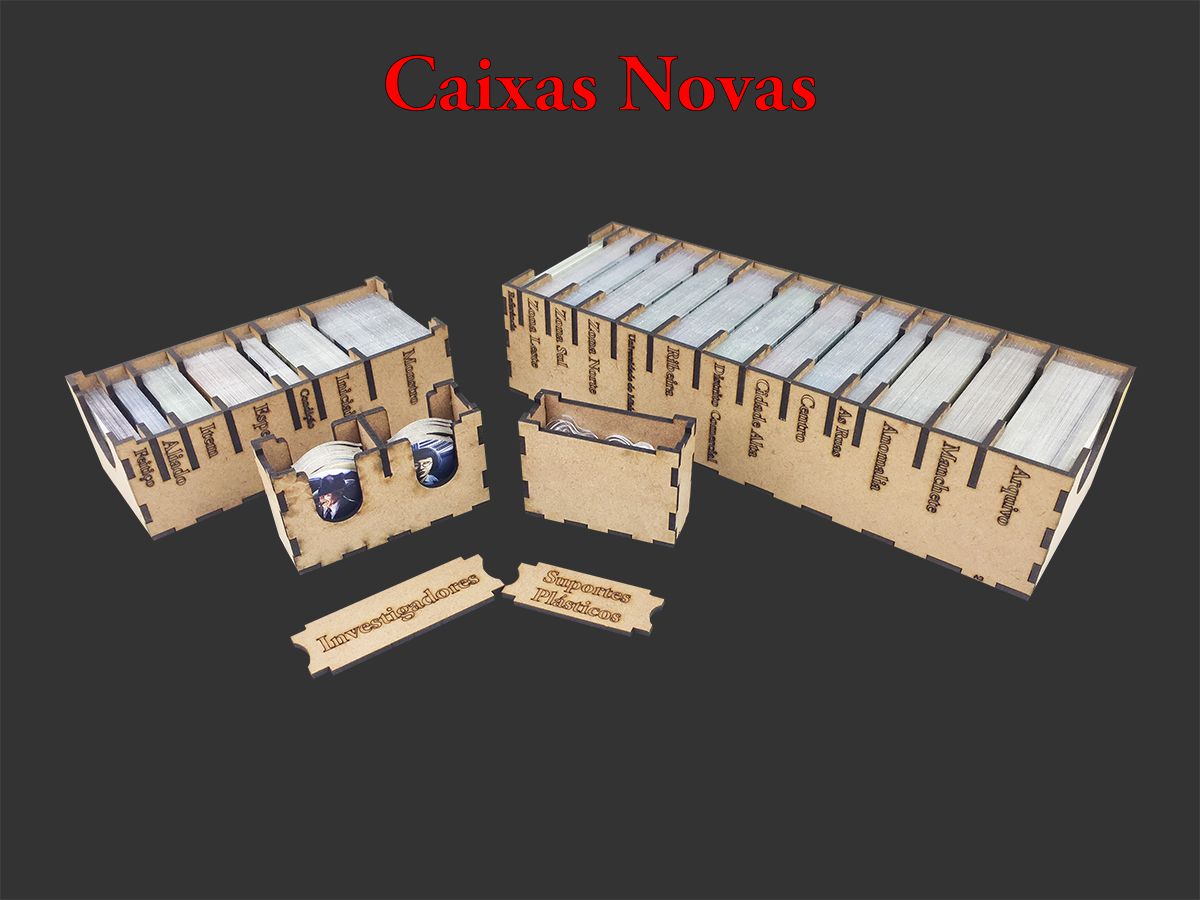 Kit com 4 caixas novas que substituem parte do Organizador (Insert) para Arkham Horror, para comportar também expansão Calada da Noite.