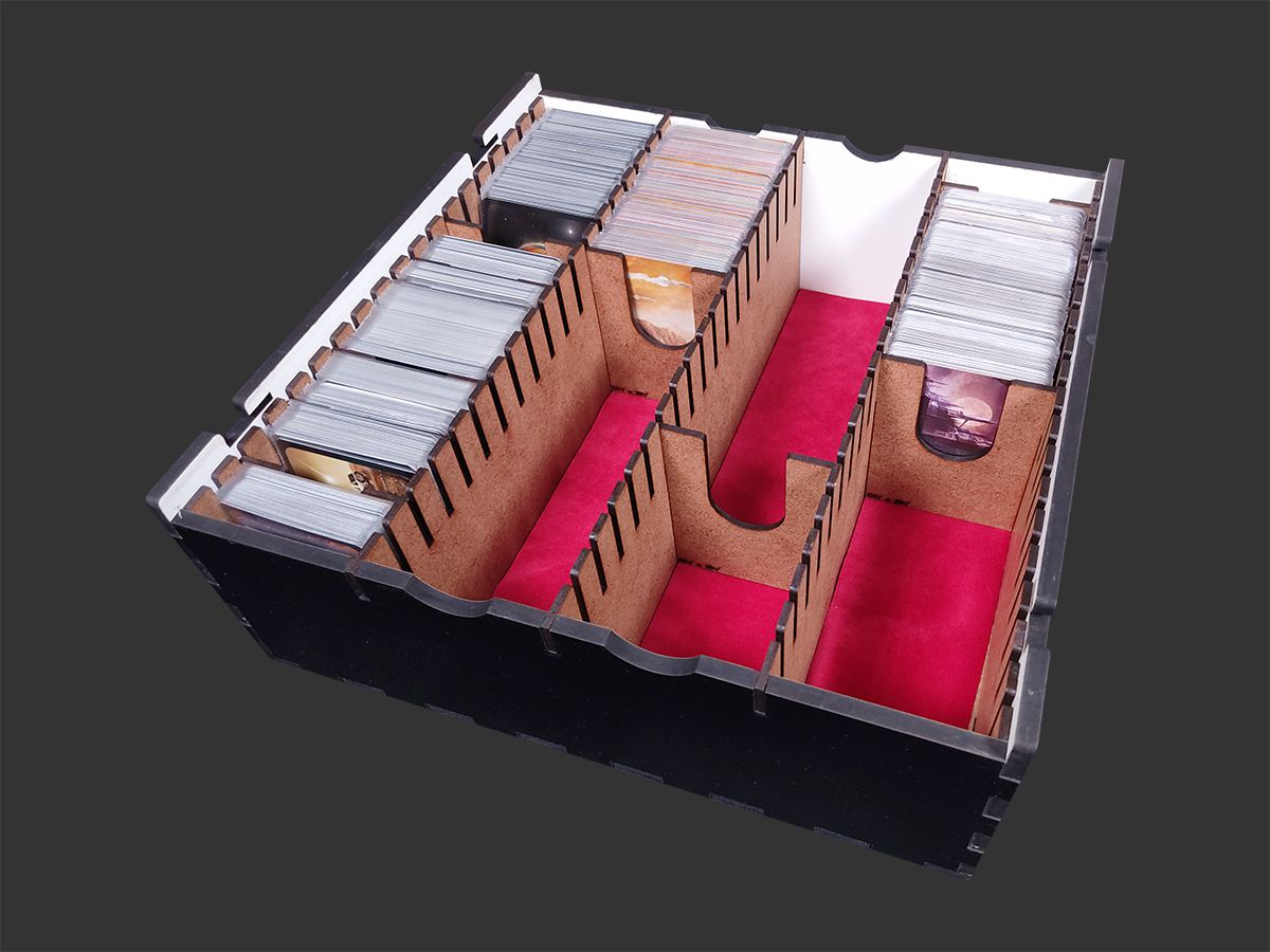 Feito em madeira MDF PRETO de 6mm (caixa) e 3mm (partes internas e separadores) e um revestimento em recido para proteger ainda mais suas cartas.