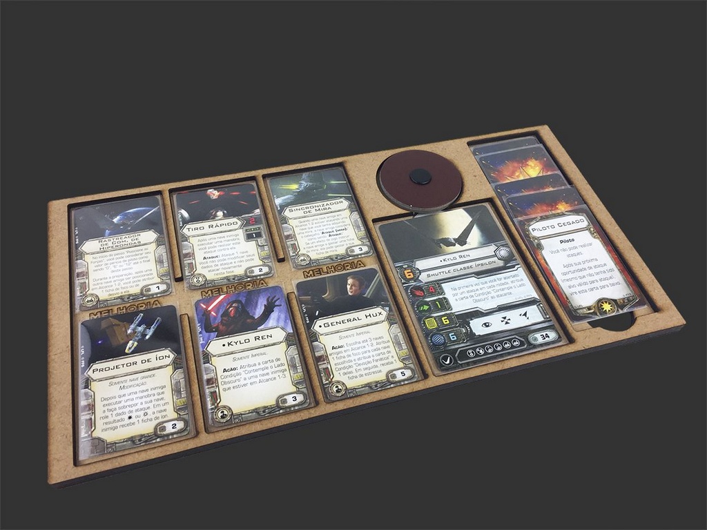 ATENÇÃO: Esse produto foi projetado para ser compatível com as primeira edições de X-Wing, com as cartas de melhorias e dano sendo menores. Não é compatível com a nova edição X-Wing 2.0 onde todas as cartas são tamanho padrão.
