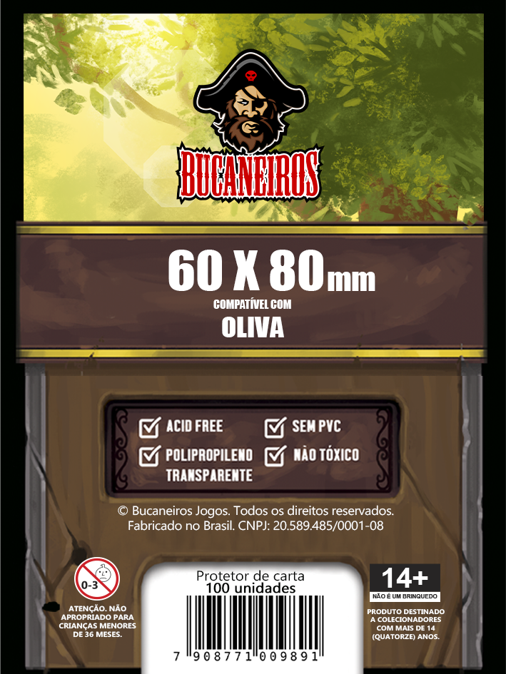 Sleeve customizado no tamanho 60mm x 80mm, ideal para proteger as cartas do jogo Oliva. Para sleevar o jogo todo, são necessários 2 pacotes